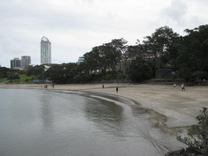 | Takapuna beach | Ikke noe strandliv ennå annet enn for måkene, da 1. vårdag var 1. september |