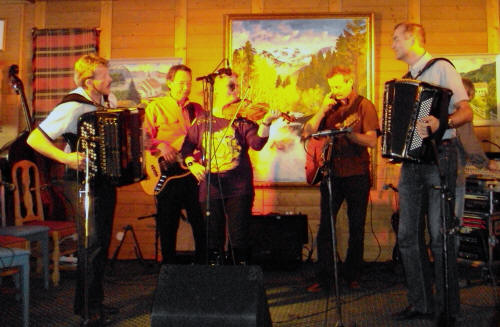 I den tradisjonsrike "Dølensalen” fann vi lokale grupper som Hornindal Trekkspelklubb, Krokarane, Nordbygda Splelemanslag som alle held seg i god speleforn og leverer stødig og bra gamaldansmusikk også med meir moderne takter. Bak trommene fann vi som tidligere "Ballan" alias Bjarne Nordsletten som framleis kan jobben sin uten å overspele. Så kom det som vart favorittgruppa denne gongen, nemleg Randis Gammeldansorkester frå Breimområde. Dei skuffa sanneleg ikkje. Ei fele, to trekkspel, gitar og bas. På fele fann vi Randi Støyva frå Breim. Elles var det Joar Dvergsdal frå Jølster på gitar, Tore Drageset og Georg Kvamme på trekkspel, begge frå Innvik. Den faste bassisten er Edvin Rand Hopland. Randi svinga seg lett opp i posisjon der tonsettinga var klokkerein og mjuk. Tankane gjekk umiddelbart tilbake til andre gode grupper med fele på topp, som Uhlens kvintett, Hans W.Brimi, Hilmar Alexandersen, Flukt og Bjørn Turtums gruppe for å nemne nokon. Fin og korrekt melodilinje, med rette "feelingen" for stoffet dei framførde. Dei andre i gruppa sørga for fint bakteppe, og resultatet vart med andre ord bortimot perfekt. Slik skal det låte. Litt Gudbrandsdal stil, men det er ikkje noko dårleg stil. Om dei ikkje har produsert CD, bør dei kontakte folk som kan hjelpe dei med det. |