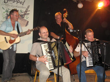 | Jens Dahlsgård (trommer) og Reidar Dahle (gitar)... | ..kompet Mogens Bækgård (t.v.) og Jörgen Sundeqvist (begge trekkspill) sammen med med Per Bredesen (kontrabass) |