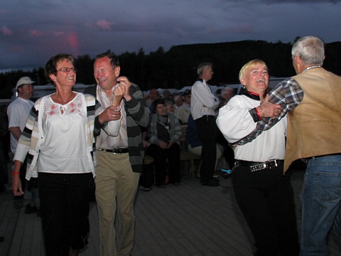 - "Fast inventar" - om en nå kan kalle det på en utescene ... er paret Bjørg Strand og Torstein Næss fra Gran (t.v.) på dansegolvene rundt omkring på festivaler, treff og tilstelninger av alle slag - Om det noengang skal deles ut en 'danse-pokal' til trofaste parkettslitere så har vi noen klare kandidater her. |