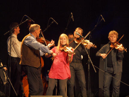 Siste inviterte gjester var "Over Stok og Steen", - det mestvinnende orkester i Landsfestivalens historie. De spiller vanligvis storgardsmusikk fra Hedemarken, og deres tradisjonsmusikk er mest lik den som spilles i distriktet til Steinsgårdskroken. Kvintettet var blitt til kvartett, da Ronny Kjøsen var blitt syk. Det planlagte repertoaret måtte derfor justeres litt til de 4 som var oppegående - Thomas Nilssen (trekkspill), Thomas Lomunddal (fele, men med syk hardingfele), Frode Slupphaug (kontrabass) og Morten Brattås (gitar). |