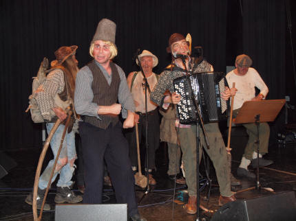 Effektive "Steinsgårdskroker" ryddet salen i en fei etter konserten og dansegulvet ble klargjort. Midtveis ble kvelden avbrutt ved at Spyttmyra tjuvjakt og spellemannslag avla en visitt. Med trekkspill, ukulele og gjeddelurk (rytmeinstrument laget av en hesjestaur, en støvel og et gjeddehue) holdt kara fra Spyttmyrsbråtavangen med Stian Carstensen og Jan Gunnar Røise i spissen, en avansert verbal forestilling der det gjaldt å følge med 1.000% for å få med seg alle poengene. Til slutt fikk vi høre karas bidrag til den lokale jule-CD'n som sikkert selges til inntekt for en "god sak" - nemlig: Raka laka tel jul! Ja, ja - vi sier med kara: Alt som koker lenge nok, blir itandes tel slutt. |