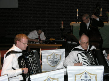 | Tor Hveding (t.v.) er musikalsk leder sammen med Simen Korsvold. Per Bredesen på kontrabass var innlånt for anledningen og hadde mange nye noter å forholde seg til... | Pål Arve Solberg (t.v.) og Yngvar Strøm i trekkspillduetter akkompagnert av Ole-Herman Finholt på gitar og Per Bredesen på kontrabass. |