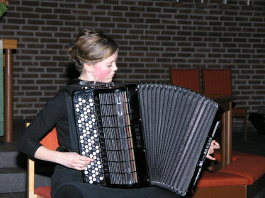 Yngvild utmerket seg tidlig som en lovende trekkspiller, og hun utvikler seg musikalsk stadig videre. Hun hadde en fin framføring av transkripsjonen "Preludium og fuge i fiss-dur" fra Das Woltemperierte Klavier av J. S. Bach. Det atonale originalverket skrevet for trekkspill av A. Nordheim, "Flashing", fremførte hun stødig og interessant. Kveldens siste konsertnummer var 1. og 3. sats av "Russisk suite" av Chenderev, som er så langt fra den atonale verden som man kan komme. Vi husker den godt da Frode Haltli spilte den i TV2's "Talentiaden" i 1991, og tok fagjuryprisen. Yngvild hadde en minst like vakker framføring og høstet trampeklapp - bare så synd at ikke så mange flere fikk med seg denne trekkspill- og korkonserten. Det nytter i alle fall ikke å klage over at det ikke er noe "trekkspillmusikk" å høre lenger... |