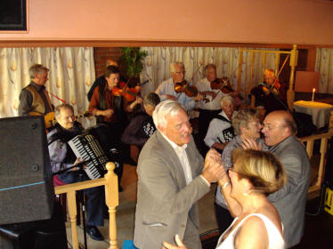 Elles finn vi veteraner som Sverre Fløtres som spelar i Åmdalen Trekkspelklubb. Etter nokre passive år kom han igjen på bana med eige orkester på Julefestane våre, og noko seinare var han igjen aktiv i klubben. Lars Håvik leverer alltid bra, og med god komp er det kjekt både å danse og å lytte til. Rutinert og kultivert, passe improvisert så fell det i smak for dei fleste. Han er også aktiv i Åmdalen som stiller i Orkdal på NM ved jonsoktider. Alf Vatne og Svein Dalane med komp, utgjorde "Møregjengen". Den kvinnelege tredjemedlemmen er Heidi Oksavik. Ho har prioritert familien ei stund, og med ansvar for 3 småbarn, får trekkspel og gjengen kvile litt. Kjenner eg ho rett, dukkar ho nok opp igjen med tid og stunder. Halkjelsvika Spelemanslag spelte godt denne kvelden som ofte før. 4 fioliner og 3 trekkspel med komp blir eit fyrig spelemanslag og dei har danseapell, med fullt golv frå førte melodi. |