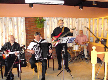 | Halkjelsvika Spelemannslag med godt driv. Musikalsk leiar Ragnar Tomasgård med trekkspel til venstre. | Sverre Fløtres kvartett med Harald Holte (gitar), Per-Jarle Hommelhaug (bass) og Bjarne Nordsletten (trommer). |