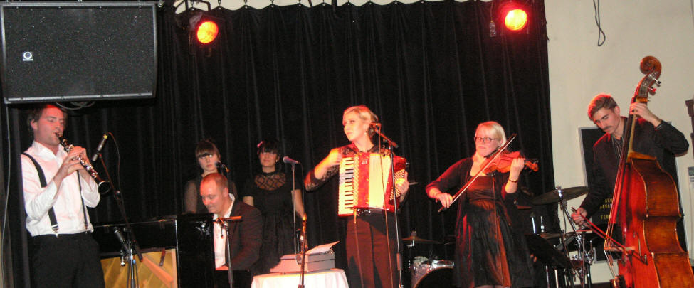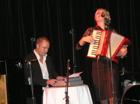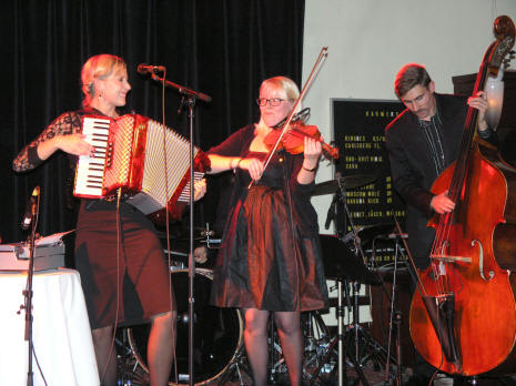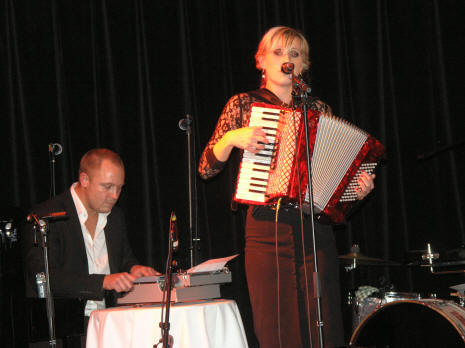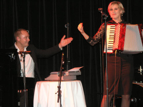 Guro entret scenen og opplyste at det var 1 ½ år siden hun og Line Grenheim på fele holdt en mini duokonsert i rommet ved siden av på Soria Moria. Den gang var det ikke i hennes tanker at hun i dag skulle stå foran en fullsatt sal på sin egen slippfest..., og nytt trekkspill har det også blitt det siste året - se Guro på "Gloria Flames". "Vi skal spille platen fra A til Å og starter med Accordion Night", sa Guro til ellevill jubel. Medmusikerne på platen var også med på scenen - Line Grenheim (fele), Anders Aarum (piano mm.), Sebastian Haugen (kontrabass) og Totto Hansen (trommer) i tillegg til kordamene Dina og Tonje. |