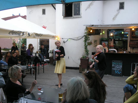 På en helt vanlig onsdag i sommer-Oslo lød det toner fra et lite, rødt trekkspill, fele og sang fra taket på en restaurant på Grønland. Onsdag 7. juli holdt nemlig Guro von Germeten sommerkonsert på "Gloria Flames". Været kunne kanskje vist seg fra en bedre side denne sommerkvelden, men med publikum trygt plassert under store parasoller og iført pledd for de som følte behov for det, var det ingen grunn til å vende hjem pga. et par regndråper. Innspilling av debutalbum hører så klart med for en artist, og dette skjer i disse dager. Rett fra studio hadde Guro tatt med seg Line Grenheim på fele. På albumet vil være samspill med flere instrumenter, men for Guro er det det lille, røde trekkspillet som står i fokus når hun akkompagnerer seg selv. Melodiene er utvilsomt inspirert av Tom Waitz og Nick Cave, og hun skriver alt materiale selv. Hun har så resolutt ikke etterkommet sin mors ønske om å skrive sangtekster som omhandler kjærlighet, blomster og solen på Kreta. I stedet handler de gjerne om sirkus og tarantella, eller hvordan det kan føles når man havner på feil hotellrom. "Spiderman" har også fått sin egen sang av Guro. "Enhver pike med respekt for seg selv ønsker seg et sirkus", sa Guro før hun fremførte "Cirkus song". |