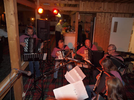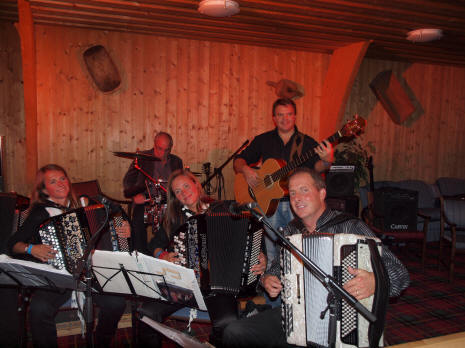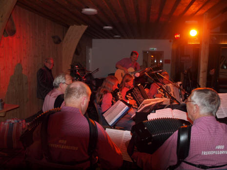 | Mer Moss trekkspillorkester ikledt sine buseruller |