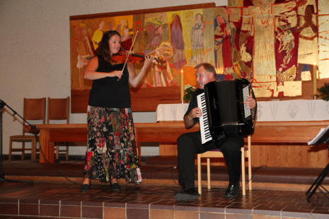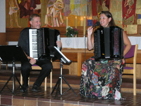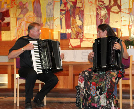 | "Vi skal åpne med det russiske stykket "I det fjerne lyder byen" for å sette dere i den rette stemning", sa Lena S. Rist-Larsen idet hun introduserte seg selv og Jörgen Sundeqvist som trekkspill-duo. |