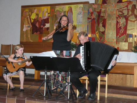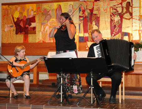 Så var det tid for scenebytte. Lenas datter, Rebekka, er bare 8 år, men har allerede spilt gitar i flere år. Hun fremførte den berømte og høyt verdsatte engelske folkesangen "Greensleeves" sittende dypt konsentrert på en liten, egen medbragt stol. Dernest ble det "familiedebut" i det neste melodiøse nummeret "Pax" av Catherine McMichael. Her fikk hun med seg Jörgen på trekkspill og Lena som da hadde byttet til fiolin.