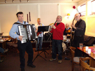Jazzklubben i Ørsta/Volda har i mange år vore aktive med innslag av høg kvalitet. På ”Kafe Grønne Treet” i Volda kan ein gå rett inn frå gata og tru ein er komen til New Orleans. Denne laurdagen var der storfint besøk av Einar Longvas kvintett frå Ålesund. Eg hadde høyrd dei før så visste litt kva eg gjekk til, og eg vart ikkje skuffa. Flott swingjazz - det meste i god Art Van Damme stil. Velformulert trekkspel med sjefen sjølv, klarinetten vart traktert av Leif Ståle Aasebø, og ikkje å forgløyme Kurt Sagen som har hatt ei svært spanande og elegant utviklingsprofil. |