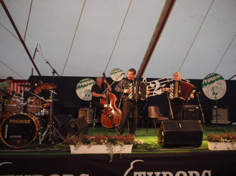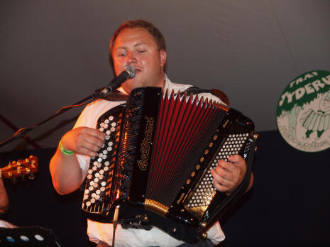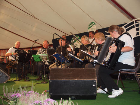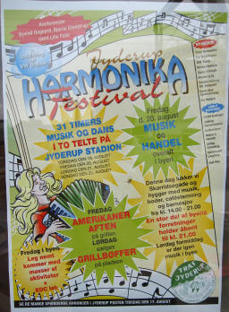 Jyderup Harmonikaklub med Mogens Bækgaard i spissen kunne i år ønske velkommen til det 20. trekkspilltreffet i Jyderup, som er lokalisert ca. 2 timers kjøring vest for København. Træf Jyderup er et av Danmarks største trekkspilltreff og er spesielt kjent for høy musikalsk kvalitet. Treffet har for lengst fått sin egen sang og med verselinjen "Det' altid uge 33 at vi møder op" er det lett å merke av i kalenderen år etter år. Et gedigent rødt og hvittstripete sirkustelt som blir satt opp på idrettsplassen for anledningen sørger for at folk har tak over hodet. Himmelens sluser åpnet seg i begynnelsen på uka og lagde bassenglignende tendenser både inni og utenfor teltet. De holdt imidlertid for det meste tett, som godt var, fredag til søndag mens treffet pågikk. Med annonsering om 31 timers musikk og dans i to telt, ble man nødt til å programsette også opptredener i kafeteriaen - populært kalt "Harmoniteriet". |