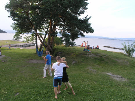 | Fra terrassen har man utsikt innover med Oslo. Nye Holmenkollen skimtes i bakgrunnen | Det var nok ikke første gang disse to hadde danset tango... |