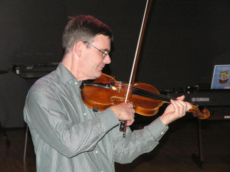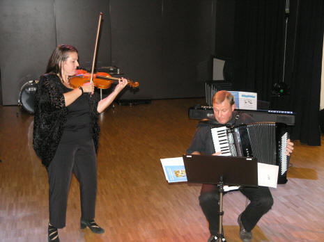 | Jörgen Sundeqvist og Lena S. Rist-Larsen i trekkspillduo på seminarkonserten: "Spansk serenade" av Olivier Metra | På fiolin og trekkspill: "Hejre Kati" av Jenö Hubay |
