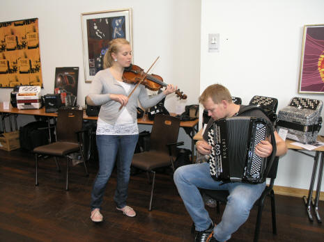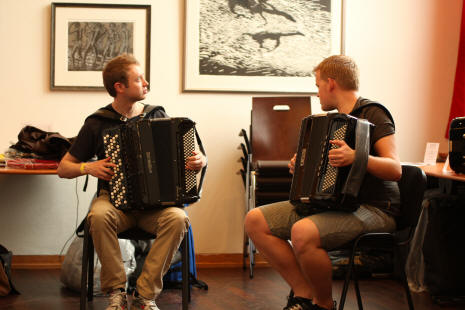 | Lærerne Glenn Sørskår og Kai Hansen, som også var NM-dommere tok seg også tid til å prøve Bugaris nye "student-bajan". | Glenn Sørskår (t.v.) og Kai Hansen |