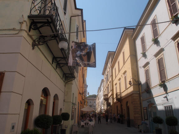 | En av de mange trange gatene i Spoleto med reklamebanner for Coupe Mondiale | Spoleto |