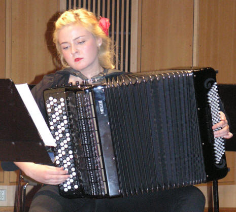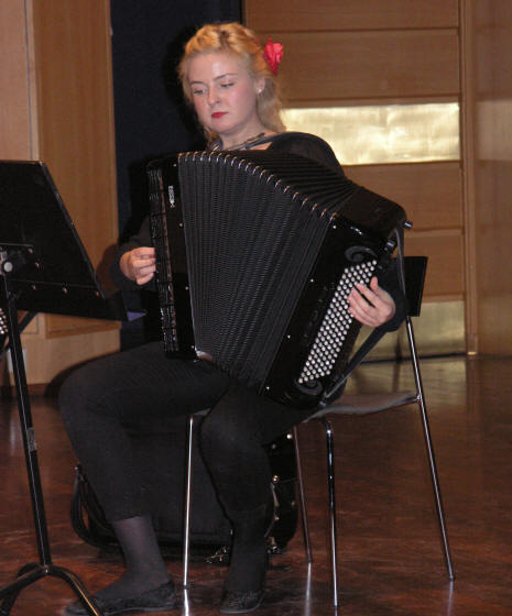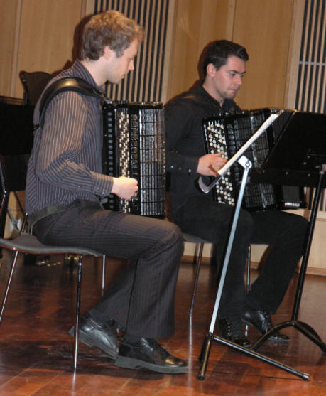Dansk musikk bød også Kristina Farstad Bjørdal på - nemlig “Tears” av Bent Lorentzen (født 1935). Han har skrevet noen komposisjoner for trekkspill og “Tears” er nok den mest populære som blir benyttet av utøvere verden rundt og høres ofte spilt ved internasjonale konkurranser. Bent Lorentzen skrev også pliktstykket “Circus” til Coupe Mondiale i København 2002. Deretter fikk vi stifte bekjentskap med den norske førsteårsstudenten Andreas Angell som med stor entusiasme fremførte Johan Sebastion Bachs velkjente “Toccata og Fuge i d-moll”, BWV 565. Sistemann ut av solistene var polakken Grzegorz Miszczyszyn som fremførte dansk samtidsmusikk - “Air”av Hans Abrahamsen (født 1952) som således er den yngste av de komponistene vi fikk stifte bekjentskap med. Han underviser bl.a. i komposisjon ved Det Kgl. Danske Musikkonservatorium. Til slutt fremførte kvintetten Astor Piazzollas "Ballet Tango" i et arrangement for fire trekkspill som var bestilt av Richard Galliano. Riktig flott var det og Kristina, som "femte-dame", påtok seg selve grunnarbeidet i denne "ny-tango"-stilen, d.v.s. den viktige bassen og rytme-akkompagnementet. For de som vil lese mer om "ny-tango" og Piazzolla henviser vi til vår tidligere reportasje iår fra "Fabrikken", se her Vi er glade for at vi fikk med oss denne konserten hvor disse unge musikerne viser at til tross for sine unge alder så har de tilegnet seg utrolig mye musikkunnskap og spilleteknikk som vi er sikker på at både vi og neste generasjon(er) vil få mye glede av. Vi kommer gjerne tilbake og lytter til dere igjen! |
