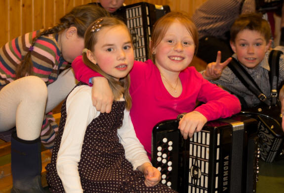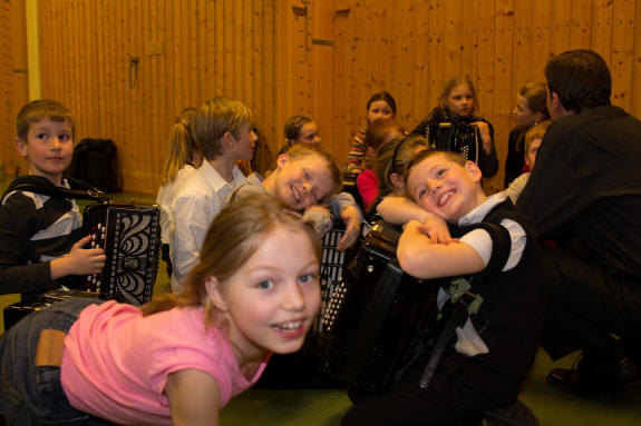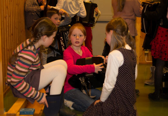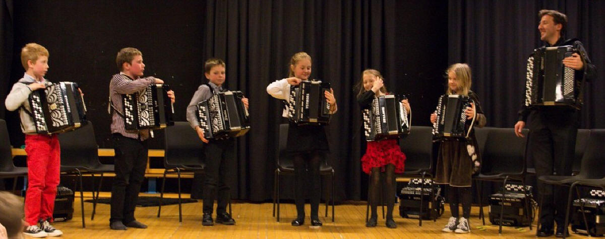 Det kan bli livlig når 18 små skal gjøre seg klare til å gå på scenen – mange for første gang. Og ikke bare skal de på scenen, men de skal ha trekkspill på magen også. Lars Røyseng bøyer seg ned mens de sitter på gulvet og venter. Noen snor seg litt utålmodig rundt, mens andre er mer preget av stundens «alvor». Han kan skilte med god erfaring med barn, da han og Stian Aase reiste rundt i flere år på ulike skoler i Norge i forbindelse med «Den Kulturelle Skolesekken». Mange barn ble på den måten introdusert for instrumentet trekkspill. Lars arbeider nå bl.a. som musikklærer for Sande kulturskole og Bærum kulturskole. Det var i fjor en del ledige plasser på trekkspill i Bærum kulturskole. Ettersom Lars også arbeider som musikklærer på Bærums Verk skole hvor det er en musikkinteressert rektor, fikk de til i samarbeid med skolen og kulturskolen nok midler til en stillingsbrøk slik at Lars kunne ta initiativet til å starte med trekkspillundervisning for de små. |