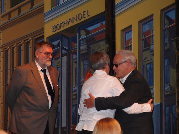 | Publikum i salongen | Konferansier Kjell Sterkerud (t.v.) og Kjell Finholt (t.h.) får en klem av Ellinor Karlsen |