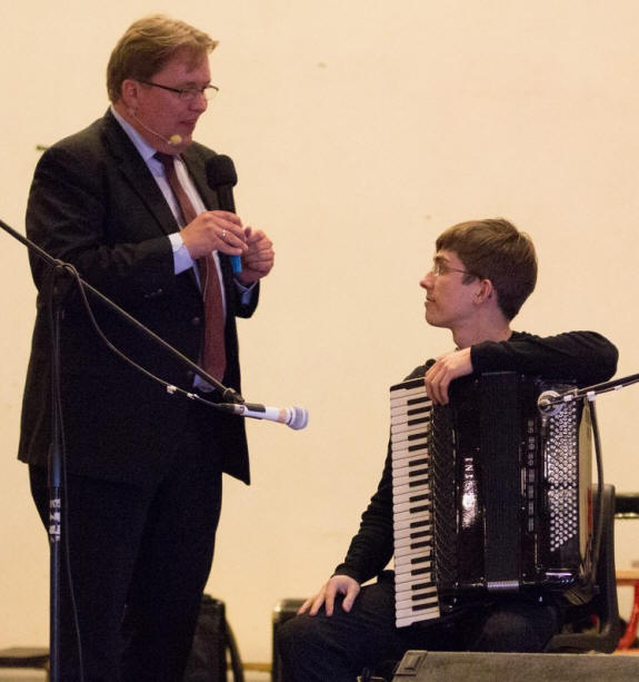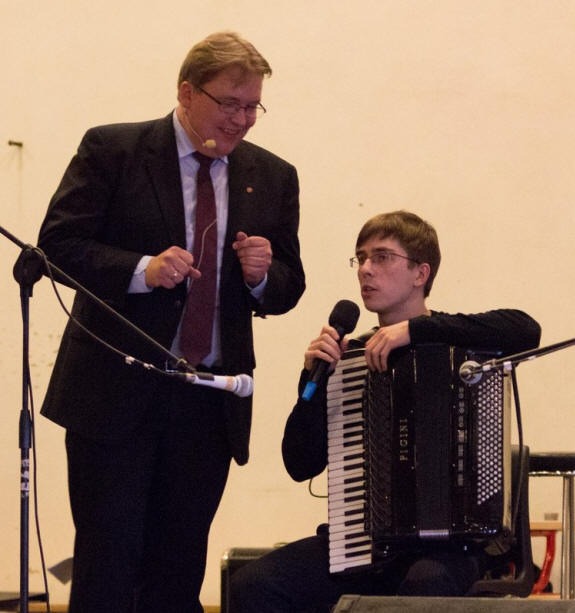 | Konferansier Sverre Myrli ledet oss behagelig og humoristisk gjennom konserten. | Sverre Myrli overlater her like godt mikrofonen til Alexander Shirunov som er blitt en riktig Norgesvenn |