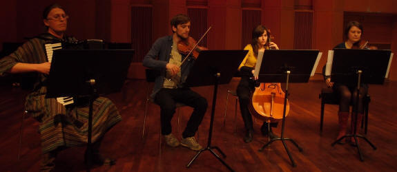 | Evelina Petrova (t.v.) med sitt prosjektorkester | F.v.: Haakon Aase (fiolin), Paula Cuesta Redondo (cello), Sarah-Jane Summers (bratsj), Laura Ellestad (hardingfele) |