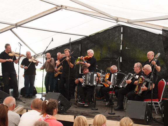 Det var lagt ekstra vekt på at festivalen skal være et treffpunkt for alle generasjoner. Det var derfor tilrettelagt for både «De unges konsert» og seniorarrangement «Fra Selbus skattkammer». Selbu kirke var smekkfull under åpningskonserten som vi dessverre ikke fikk med oss. Lørdagen startet med frokostdans på Camp Eggen. Straks etter frokostdansen var det satt opp familiekonsert med Stian Carstensen og Ola Kvernberg, i utgangspunktet tiltenkt den yngre generasjon, men den «eldre garde» syntes nok dette var like fornøyelig. Utpå ettermiddagen var det hovedkonsert i «teltet». Deretter kunne man trekke inn i Jøversalen på hotellet til konserten «Mestermøte». Her kunne man bli nærmere kjent med Lars Karlsson og Skjalg Bjørstad gjennom musikk og samtale ledet av Andreas Reitan. Begge har sterke personligheter med både stor musikalsk bakgrunn og fremtredende verbal formidlingsevne. Intimkonserten foregikk akustisk og de begrensede antall plassene ble fort fylt opp. I tillegg var det selvsagt rikelig med drivandes dansemusikk fredag og lørdag kveld til de engasjerte grupper og orkestre: Selbu Felebyggerlag, Draug, Ole Bjarnes, Ole’s, Odd Inge Moslet m/venner, Elvetuns Orkester, Lars Karlsson Band, Toraderjutulan, Blåhåmmar’n Toraderlag, Selbu Trekkspillklubb, Skjalg Bjørstad, Kviknegutta, GammelDan’s Orkester. |