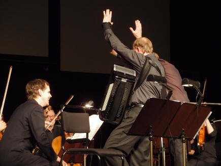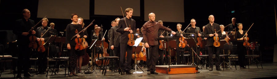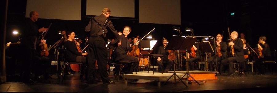 | Solist Jörgen Sundeqvist hilser på 1. fiolinisten |