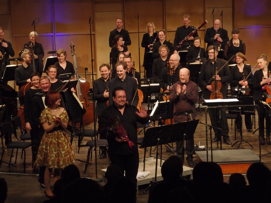 | Komponist, solist, dirigent, skuespillere og orkestermedlemmer - alle godt fornøyde :-) |