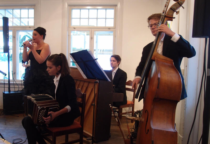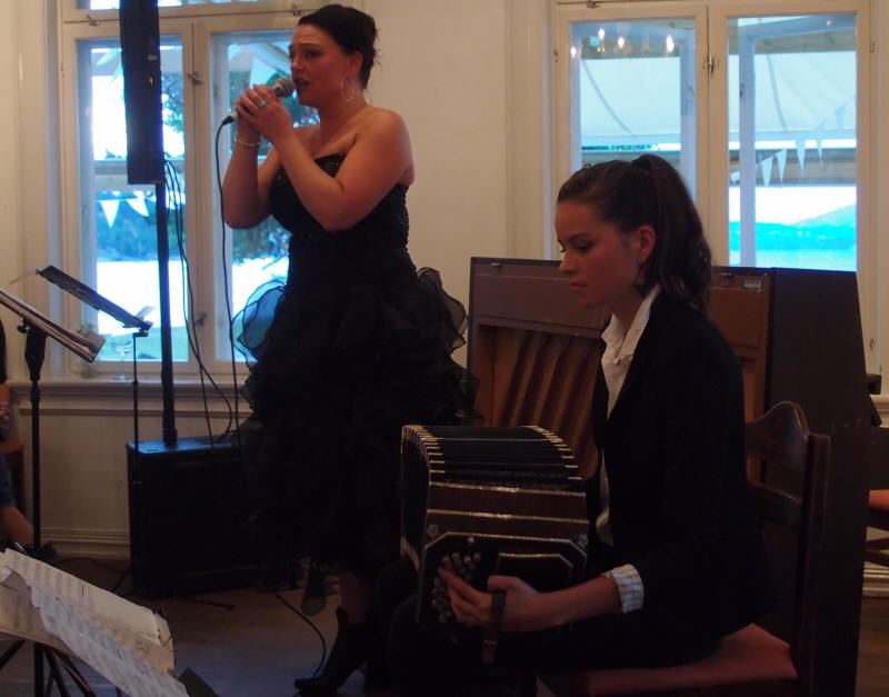 Søndag 9. august var det mer enn bare sommerstemning som lokket folk til Hellviktangen på Nesodden i Oslofjorden. «Los Osos Polares» har i år vært på sommerturne med konserter i Alvdal, Hamar, Lillehammer, Nesodden, Kongsvinger, Elverum og med Grand Finale i Storstuggu på Røros. Vi må innrømme at vi etter søk på Google translate fant ut at Osos Polares betyr isbjørn på spansk. De synes selv at dette var en passende navn på en norsk gruppe som forsøker å formidle varm og temperamentsfull argentinsk musikk. Kvintetten består av Ingrid Nyhus (vokal), Rannveig Ryeng (fiolin), Åsbjørg Ryeng (bandoneon), Håkon Magnar Skogstad (piano) og Ole Herman Schøyen Sjölin (kontrabass), og er dermed et autentisk argentisk tangoorkester som krever at man har med minst ett bandoneon i besetningen. De startet opp i 2009 og er godt skolerte hva gjelder musikalsk bakgrunn. Åsbjørg Ryeng avsluttet sitt kandidatstudie i mai ved Norges Musikkhøgskole med Bacheloreksamen og eksamenskonsert på det ikke så rent kompliserte instrumentet – bandoneon. Bandoneonet ble oppfunnet i 1855 av tyske Heinrich Band (1821-1860) og var opprinnelig tenkt å fungere som et transportabelt kirkeorgel, men havnet fort i et noe annet miljø på bordellene i Argentina. Åsbjørg hadde en liten demonstrasjon av hvordan knappesystemet på instrumentet fungerer – eller helst kanskje mangel på system. |
