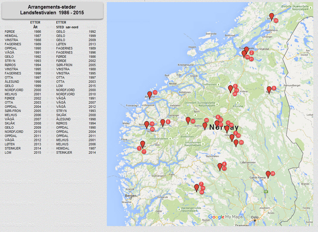Kartframstilling fra oversikt på FolkOrg: http://www.folkorg.no/arrangorar-av-landskappleiken-og-landsfestivalen/ Landsfestivalen er med årets festival i Lom arrangert ialt 30 ganger, på 18 forskjellige steder - fra Geilo i "sør-vest" til Steinkjer i nord.
