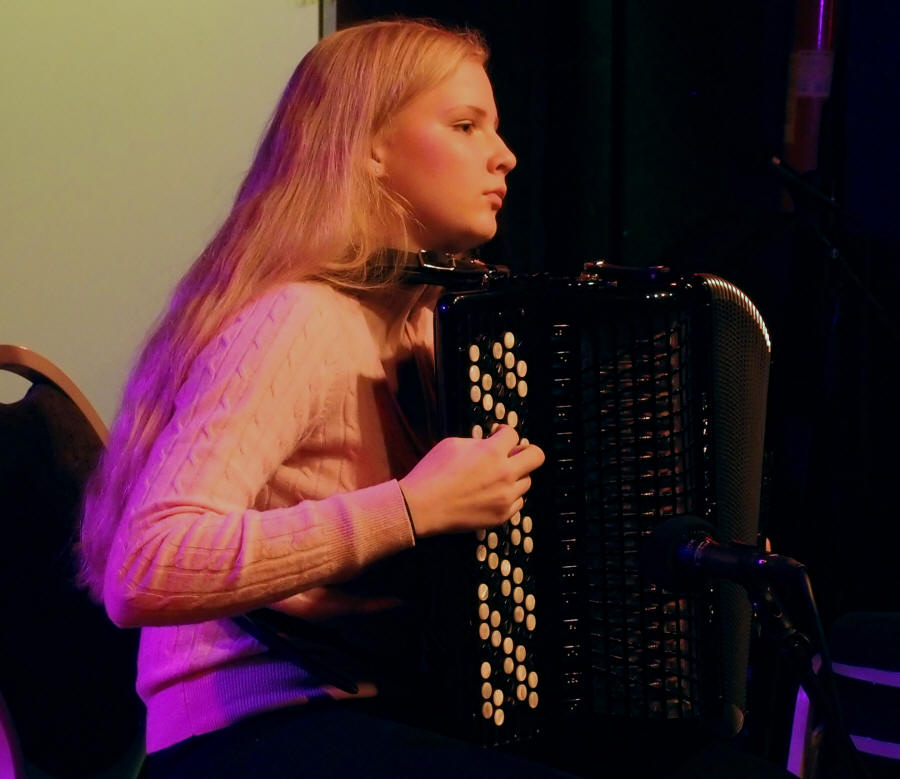 | Anna Ouff Grøthe (t.h.) 12 år fra Fisarmoniske orkester varmer opp før solonummeret | .Anna Ouff Grøthe 12 år spilte solo: "Scherzo" av John Gart |