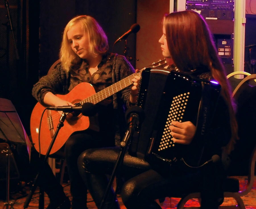 | Rebekka Plagge Rist-Larsen (t.v.) og Anna Ouff Grøthe - begge 12 år - spilte duett på konserten. De er ofte å høre under gruppenavnet "Tøffe jenter". Jentene har oppnådd flotte resultater under flere NM på trekkspill og stakk av med publikumsprisen i 2013. |
