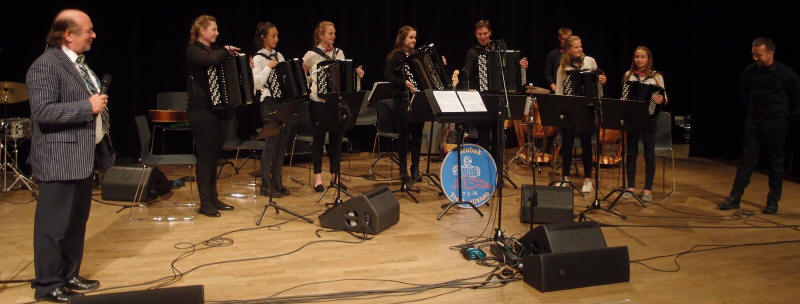 Konferansieren må vi heller ikke glemme å nevne. Dette var ingen ringere enn Gunnar GP Pedersen, en kjente stemme, programleder og entertainer fra radio og TV for oss som har levd en stund – alltid med en god historie. Han kan også sies å være mer enn gjennomsnittlig interessert i trekkspill og har alltid sitt eget lille pianospill i bagasjen – i tilfelle det skulle være bruk for det. Det ble det også denne ettermiddagen. Fakta om komponister o.l. hadde han også undersøkt godt på forhånd. |