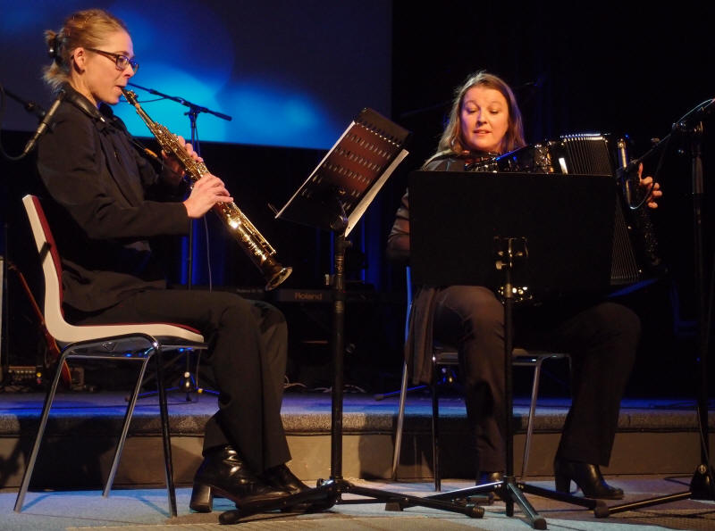 MSK-jubilantene åpnet konserten med tre låter fra plata samt en urframføring av middelalderballaden ‘Kråkevise’ med deres faste vokalist Marlene Carlsen. Ås Trekkspillorkester har et nært samarbeid med MSK og var selvsagt invitert til å bidra med et musikalsk innslag. Duoen Lena Rist-Larsen (trekkspill) og Hedvig Holst (sopransax) hadde et todelt innslag. Første del var klassisk musikk fra de tyske barokk-komponistene J.S. Bach og G.P. Teleman, som forøvrig ganske sikkert hadde villet skrive musikk for disse instrumentene om de hadde vært ‘oppfunnet’ på den tiden. Den andre avdelingen handlet om tango. Rekruttorkesteret avsluttet sin avdeling med ‘Eventyret om en melodi’ av Gustav Lorentzen, der selveste konferansier Per Emil Grimstad, forøvrig tidligere medlem i MSK, var historiefortelleren. Adrian Kiss har uten tvil arvet sine foreldres musikalske gener, men i motsetning til trekkspill har han satset på trommer og piano.På piano fremførte han ‘Blues for Gilbert’ som egentlig er skrevet for fire køller og vibrafon. MSK med gjester avsluttet konserten med to hovedlåter i rockeprosjektet deres, og som også er å høre på den nye CDen. |