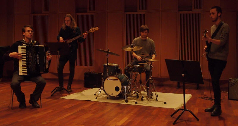 Trekkspillstudentene på Norges Musikkhøgskole (NMH) presenterte nok en gang musikk innenfor ulike sjangere som klassisk, samtidsmusikk, folkemusikk, tango, jazz og Balkanmusikk - alt spilt på instrumenter med belg på midten - også i samspill med andre instrumenter. Konserten ble avsluttet med balkantoner fra Bjørn-Petter Tøsses trekkspill. Vi fikk umiddelbart assosiasjoner til Farmers Market - ikke bare fordi han hadde hjelp av Gabriel Øien Carstensen (sønn til Stian Carstensen) på perkusjon, men også hadde med gitar (Daniel Delchev) og bass (Simen Wie) - til og med bassistens hårpryd kunne minne om Finn Guttormsens...;-) |
