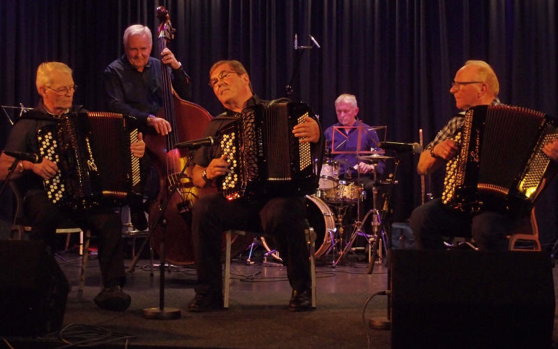 | Nordkappkvintetten spilte sammen første gang for 40 år siden - foran f.v. Bjørnar Pettersen, Kjell Harald Langhaug, Karsten Pettersen. For anledningen Per Bredesen (kontrabass). Perkusjonisten er for oss ukjent, men noen kan kanskje hjelpe? |