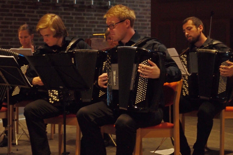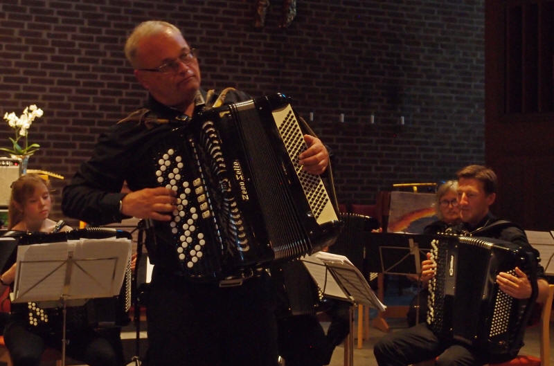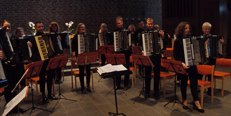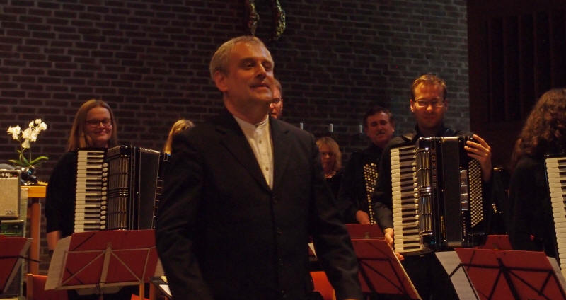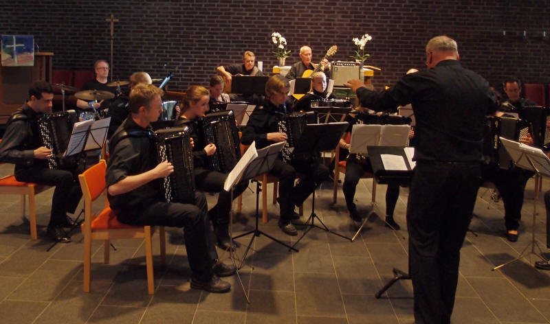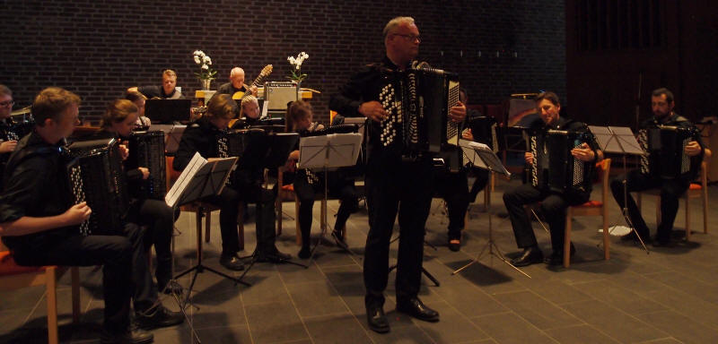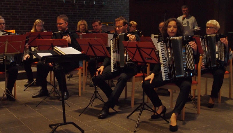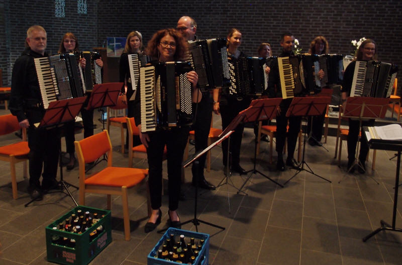 NAO ble stiftet i 1946 og består i dag av ca. 27 trekkspillere som i all hovedsak er amatører . De er meget aktive, har vunnet flere førstepriser i ulike internasjonale konkurranser og holder konserter til stadighet i inn- og utland. Nåværende dirigent og musikalske leder er Stefan Hippe som har innehatt denne rollen siden 1998. De spiller en del samtidsmusikk, men repertoaret er hovedsaklig klassisk musikk – slik som vi fikk høre i Stovner kirke. Edvard Griegs ‘Våren’ (Melodie nr. 2) var også på programmet , men man kan trygt si det var mer enn ‘vår i luften’ denne kvelden. Det har aldri noensinne blitt målt høyere temperatur i Norge i mai måned. NAO hadde hørt at Norge er et kaldt land og kunne ikke forstå at gradestokken viste over +30C . Etter at de hadde avsluttet sin avdeling kunne det dermed ikke passe bedre enn at de overrakte OTK to kasser medbragt lokalt tyskbrygget øl. Dette var den eneste konserten de skulle ha i Norge denne gangen, men vi får håpe at de kommer tilbake ved en senere anledning. |