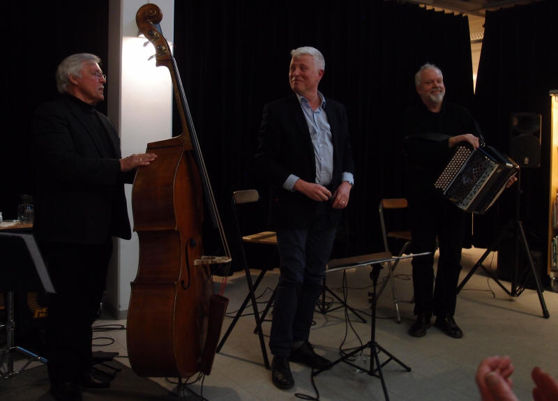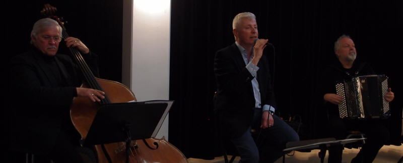 I anledning av at Vidar Sandbeck i år ville fylt 100 år den 21. juli, har duoen ‘Den Gode Melodi’ bestående av Leif Blix på vokal og Lars Nygaard på trekkspill laget en hyllest til jubilanten og vi fikk anledning til å overvære en av de siste konsertene på Østlandet torsdag 19.04.2018 i Ski bibliotek støttet av Fond for utøvende kunstnere. Duoen har også hatt med seg Stig Adolfsen på kontrabass. De åpnet konserten med ‘Menuett i mai’ som passet godt årstiden tatt i betraktning. |