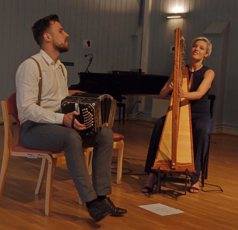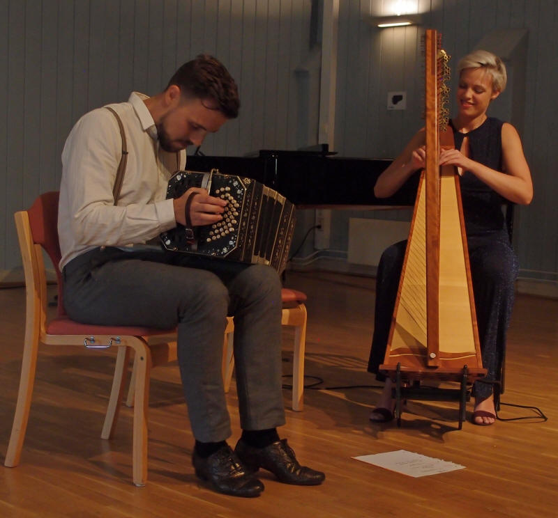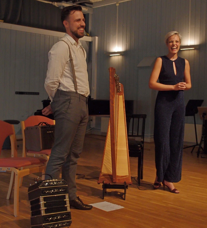 Lillebror Andreas startet å spille trekkspill 6 år gammel fordi han syntes det hadde så glade toner. Da har var 10 år spurte læreren om han var interessert i å spille bandoneon, og han tok utfordringen med å lære seg dette og gikk dermed over til melankoli. Instrumentet han spiller på i dag er nesten 100 år gammelt og er en liten boks full av magi. Det har røtter fra Tyskland på 1850-tallet og ble introdusert av Heinrich Band - derav navnet bandoneon - og med dette hadde altså tyskerne laget noe meget ulogisk når man får demonstrert hvordan f.eks. en skala spilles på instrumentet. Harpen Julie bentyttet på konserten er til sammenligning bare 3 år gammel og er en skotsk folkeharpe med klaffer som gjør at hver streng har to ulike toner avhengig av klaffens posisjon. Julie måtte til Buenos Aires for å lære spille tango på harpe. Der har også Andreas studert og begge har hver sin mastergrad på sine respektive instrumenter.Søskenparet trives godt med å spille sammen, og ved valg av 'bandnavn' havnet de på det kreative navnet duoen 'Julie & Andreas'. |