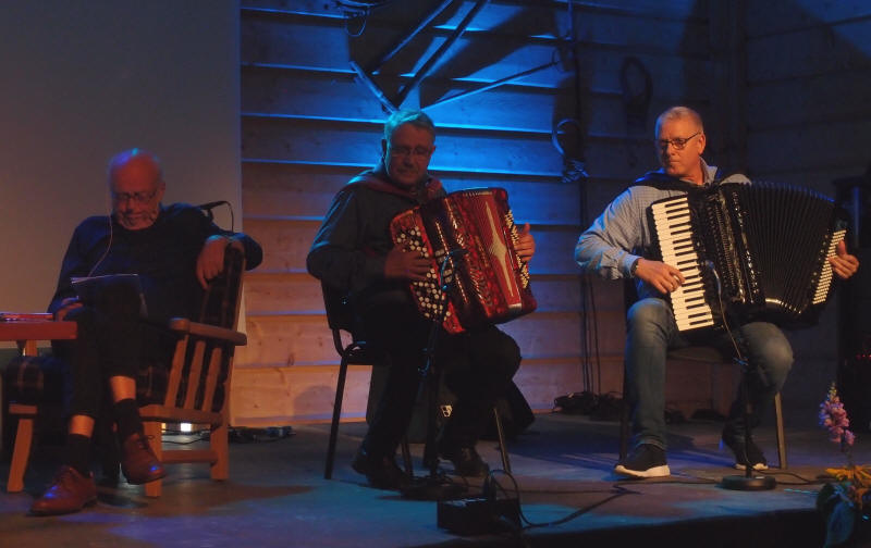 | Svein Midtlien (t.h.) og leder Fron trekkspillklubb (?) hadde et musikal Nygaard-innslag under kåseriet. |