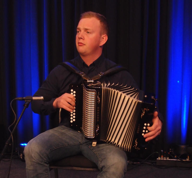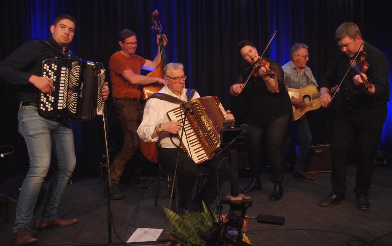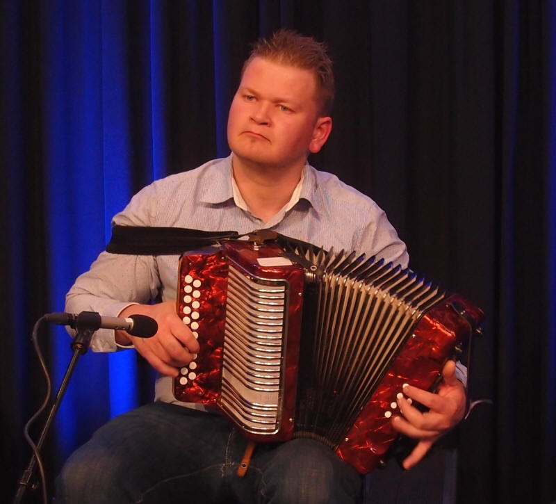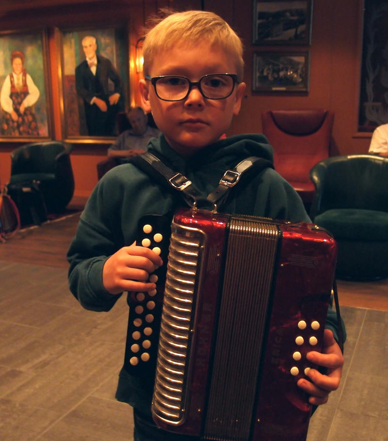| Lars Nibstad (t.h.) hadde funnet fram det gamle trekkspill til far, Andres (avbildet på maleriet i bakgrunnen), og lot Espen Barlund Nicolaisen få ære av å prøvespille det. |